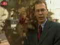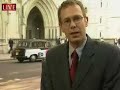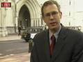 Description: Sky News Correspondent Thomas Moore manages to keep his compusure as a joker showers him with leaves in the middle of a live broadcast outside London's High Court. |